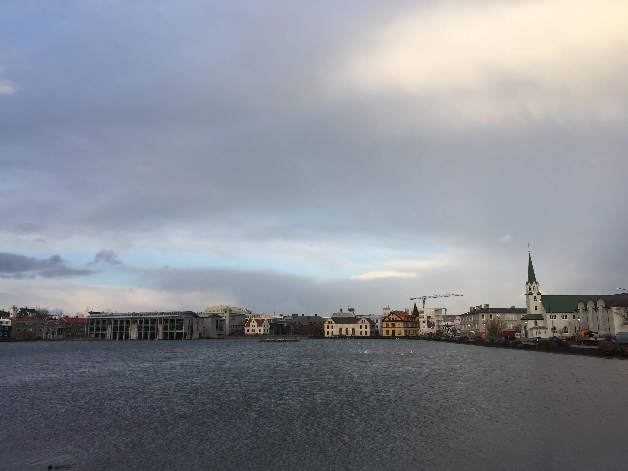 Fríkirkjan í Reykjavik is a church by the lake Tjörnin, seen here on the far right.