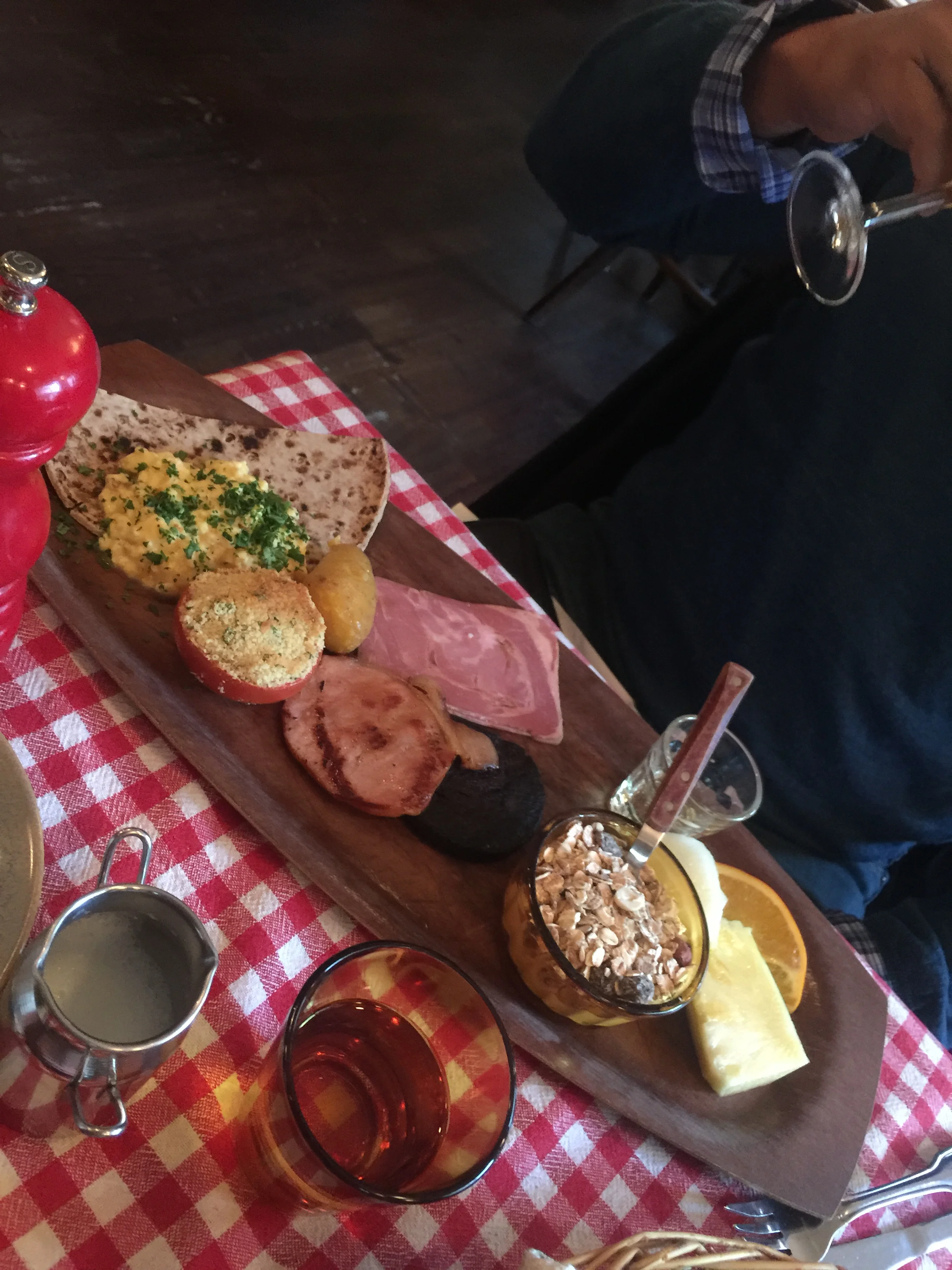 Traditional Icelandic breakfast, eggs, flat bread, smoked lamb, ham slice, musli and skyr yogurt,