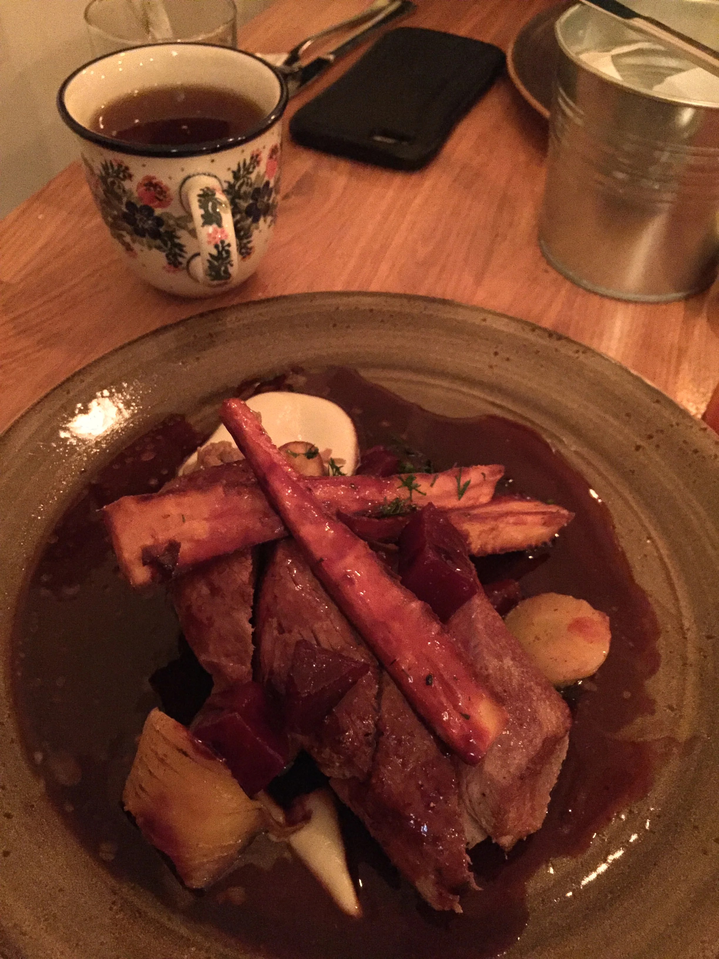 Lamb and root vegetables, delicious meal at Iceland House restaurant.