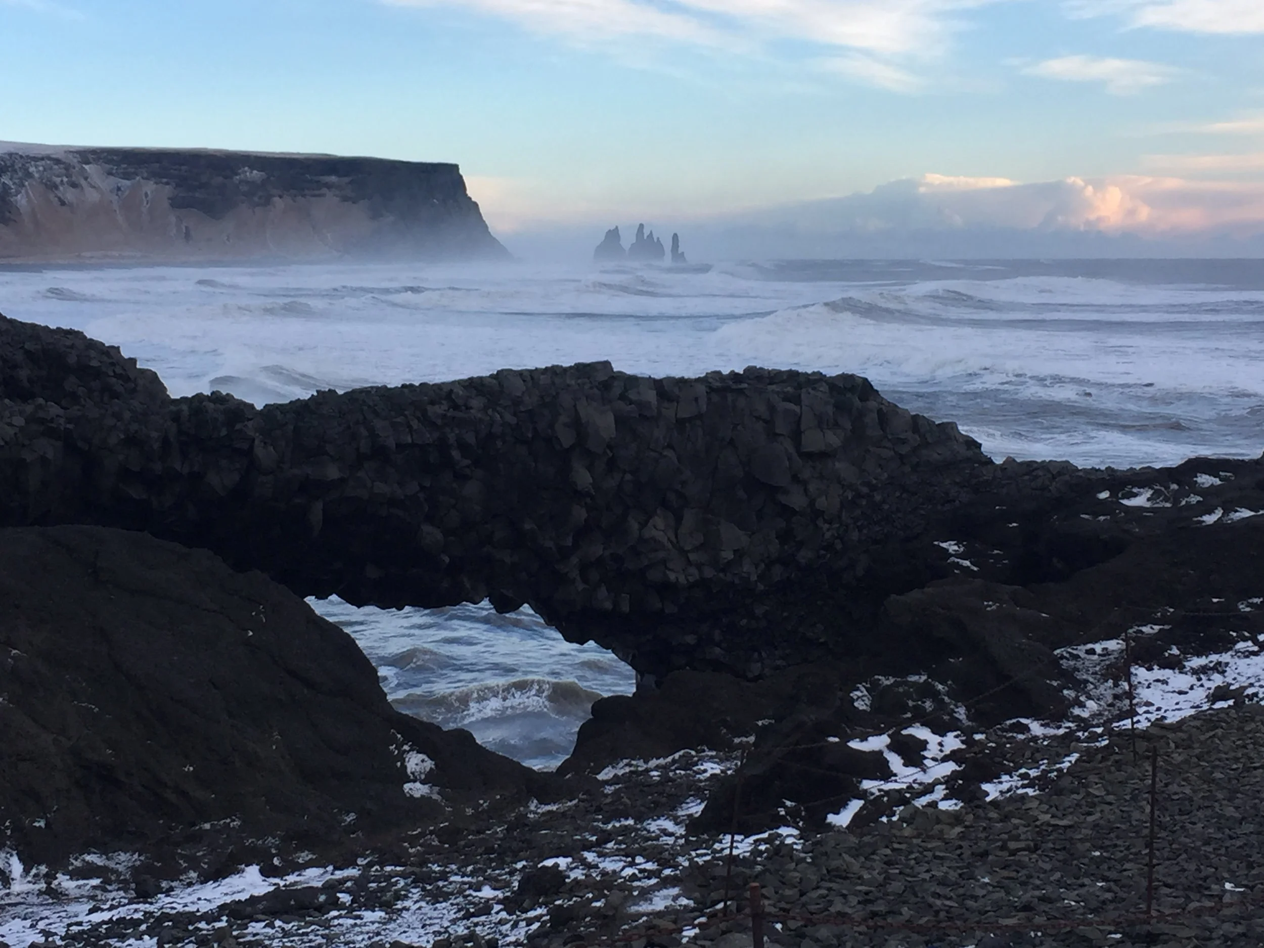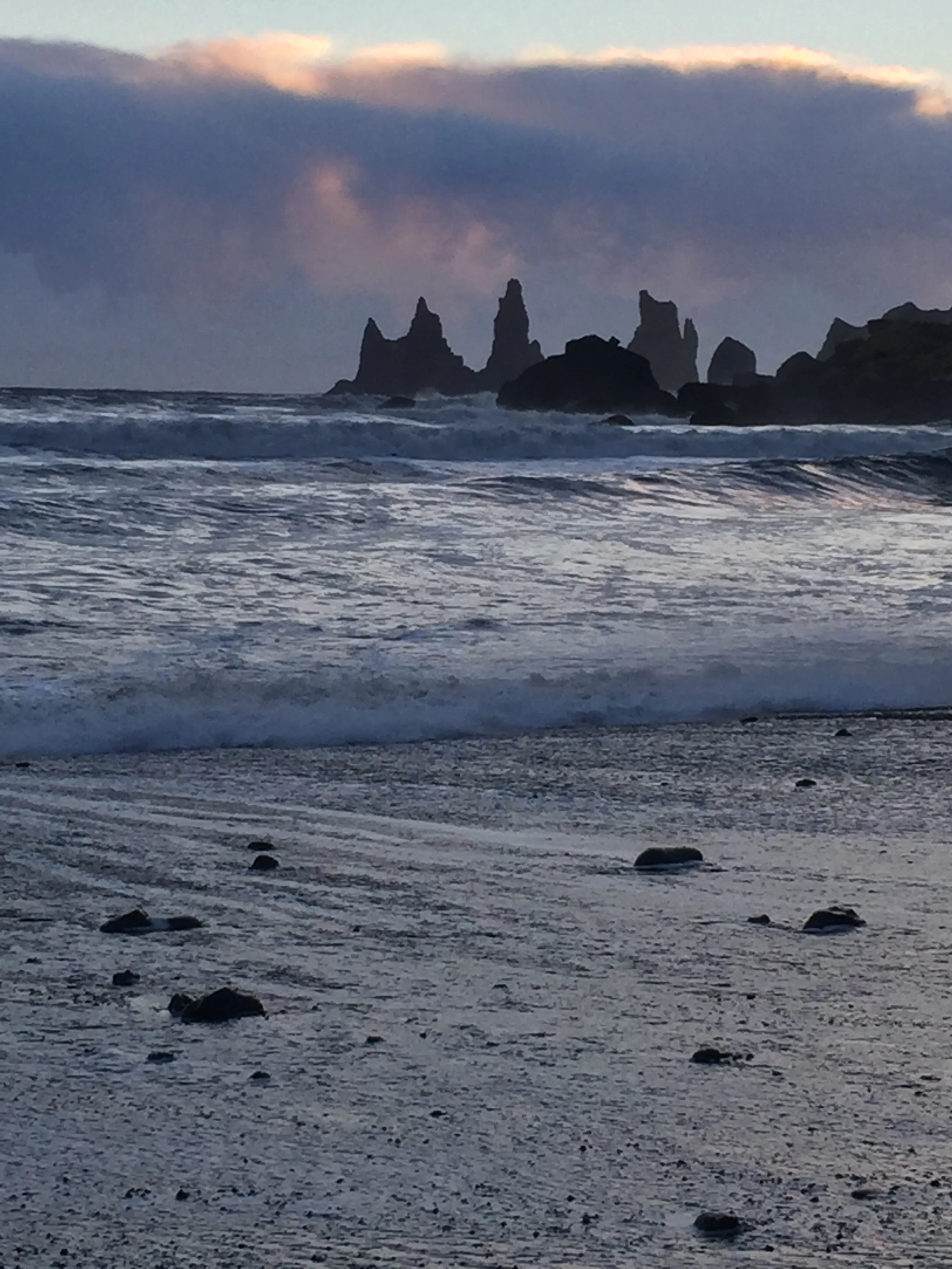 Courtesy of Wikipedia: "In 1991, the US journal Islands Magazine named the beach in Vik as one of the ten most beautiful beaches on Earth. Its stretch of black basalt sand is one of the wettest places in Iceland. The cliffs west of the beach are home to many seabirds, most notably puffins which burrow into the shallow soils during the nesting season. Offshore lie stacks of basalt rock, remnants of a once more extensive cliffline Reynisfjall, now battered by the sea. There is no landmass between here and Antarctica and the Atlantic rollers can attack with full force."